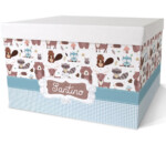 Con moño de de tela y tarjeta de salutación, en bolsa de regalo.